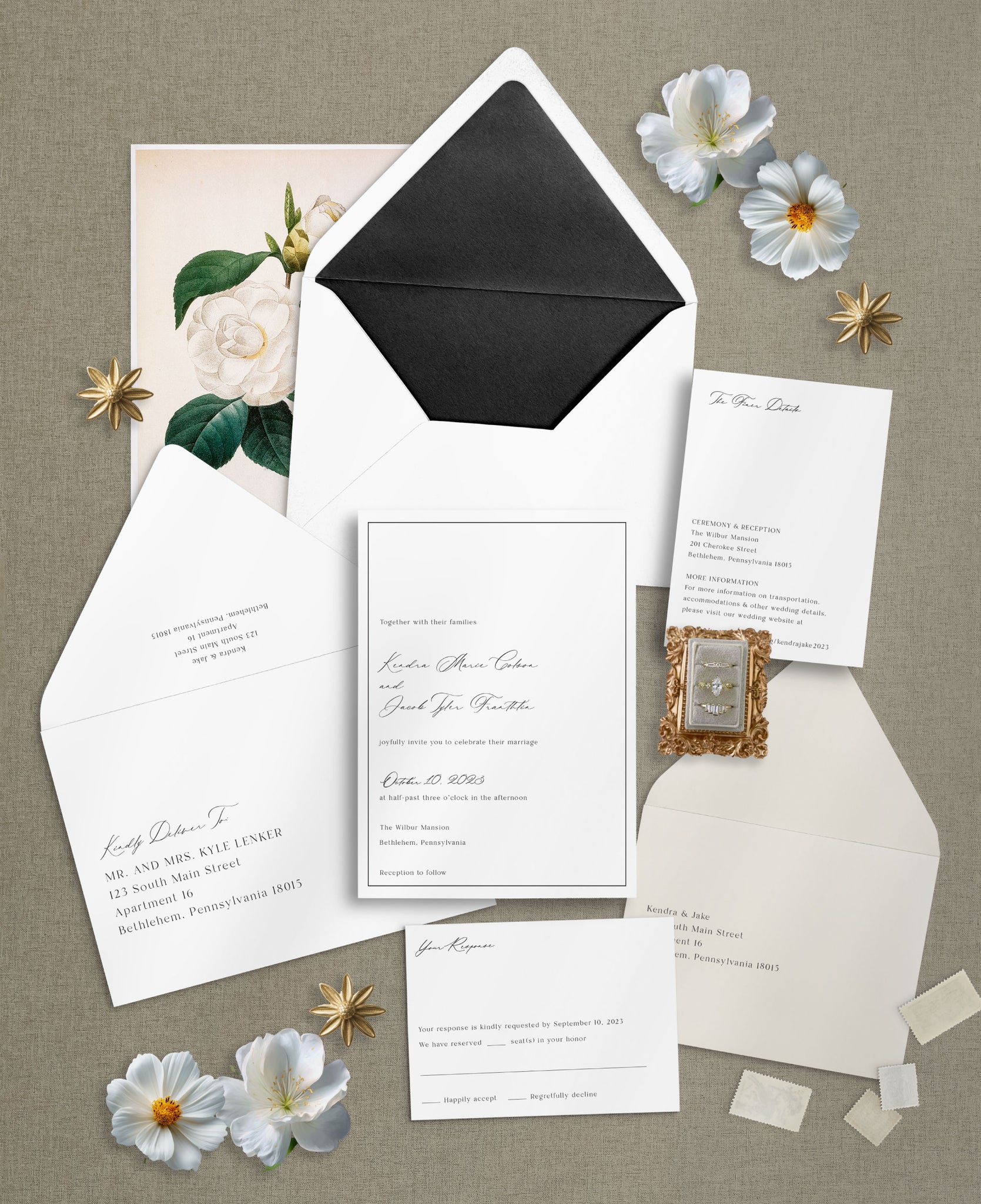 The 3-Piece Set includes the Invitation Card, Details Card, and Outer Guest Envelope – perfect for online RSVPs.