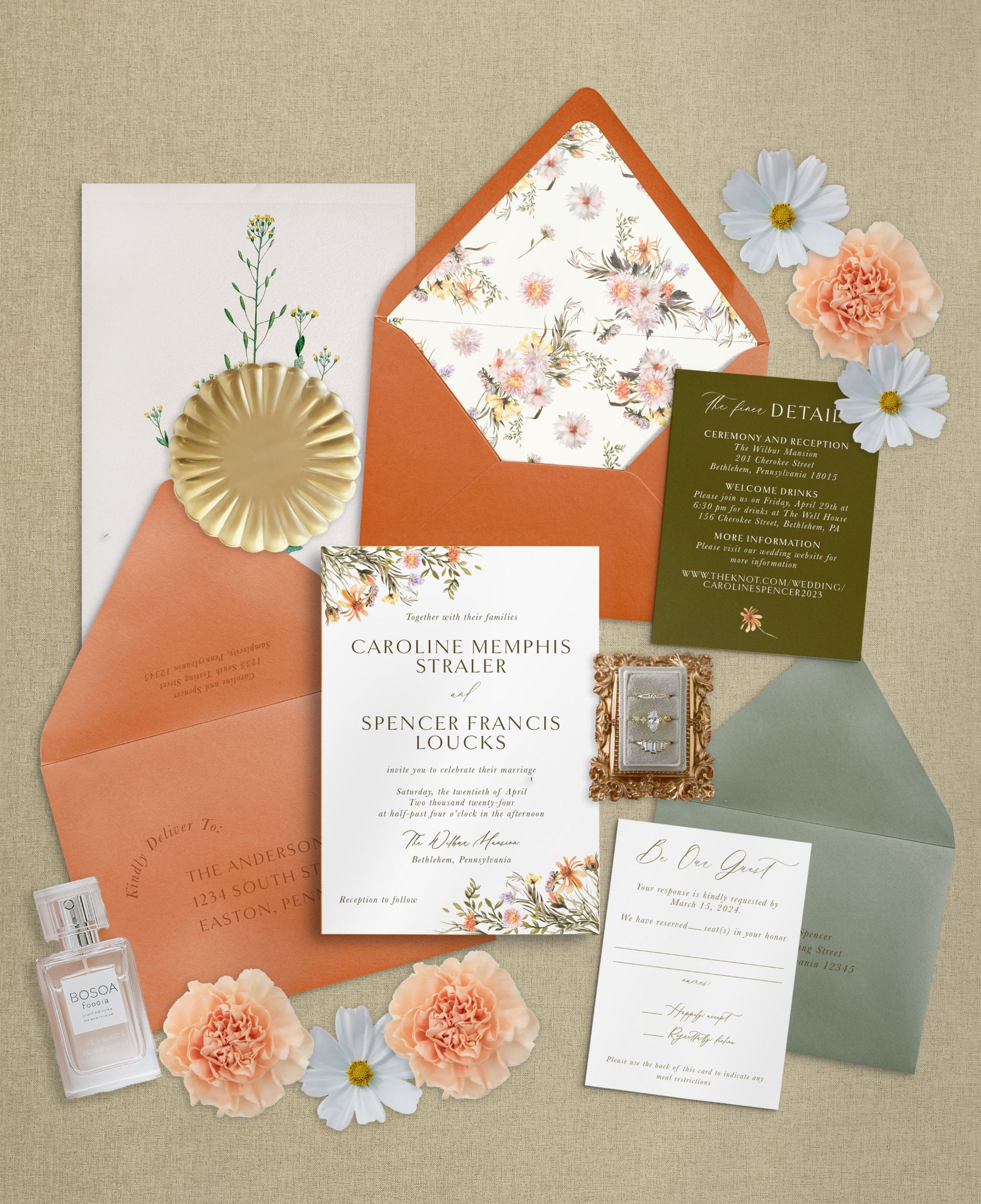 The Blossom & Vow invitation suite features soft wildflower illustrations, rich terracotta and sage tones, and elegant serif typography for a look that feels both timeless and full of heart. Designed for couples who love romantic details with a natural, organic feel, this suite brings a poetic softness to your wedding’s first impression.