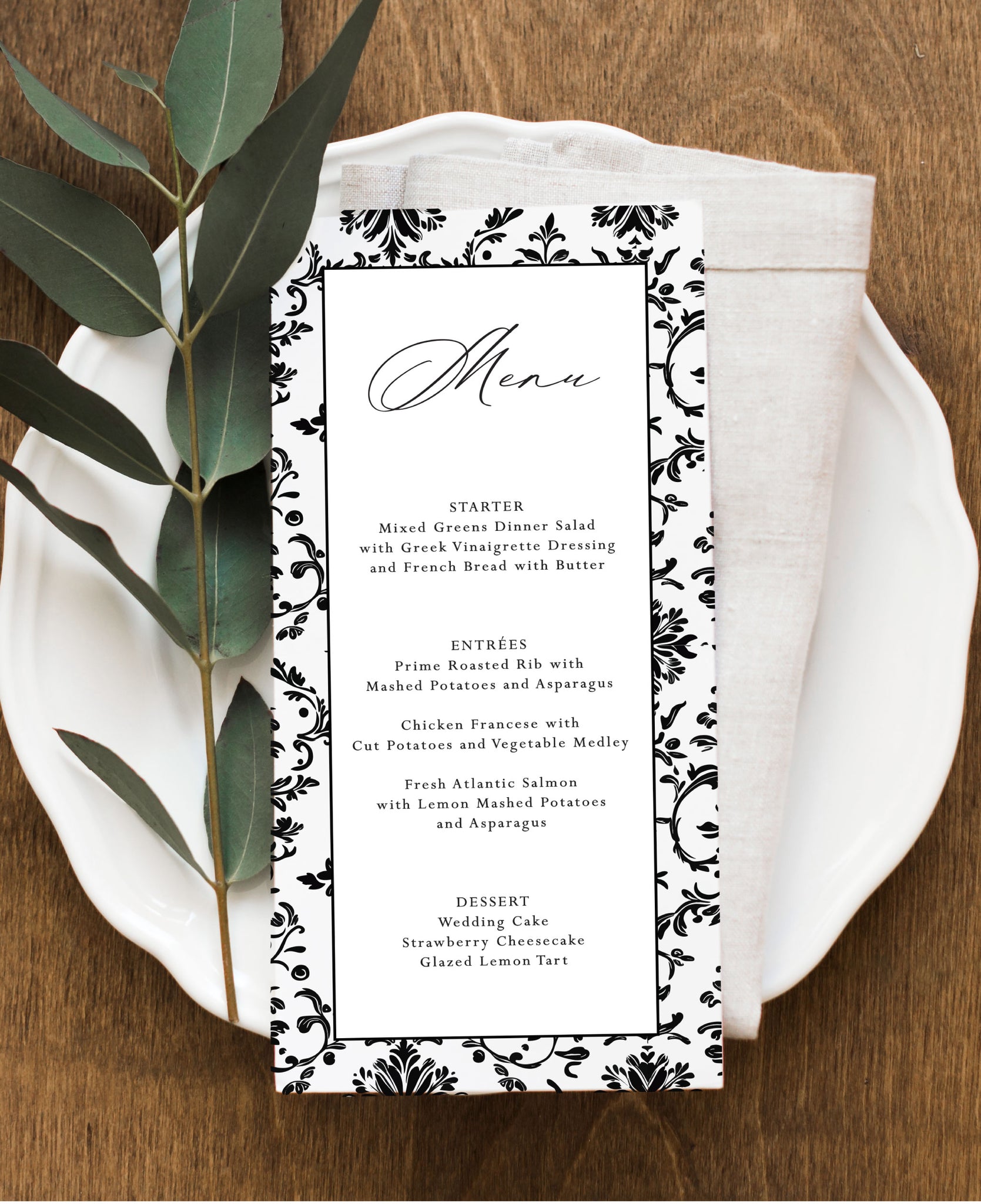 Make your wedding dinner truly elegant with our Ink and Ivory Wedding Dinner Menu. Designed to match our autumn elegance collection, this menu can be used for each guest setting or one per table, keeping your reception looking cohesive. Take your fall wedding to the next level of sophistication!