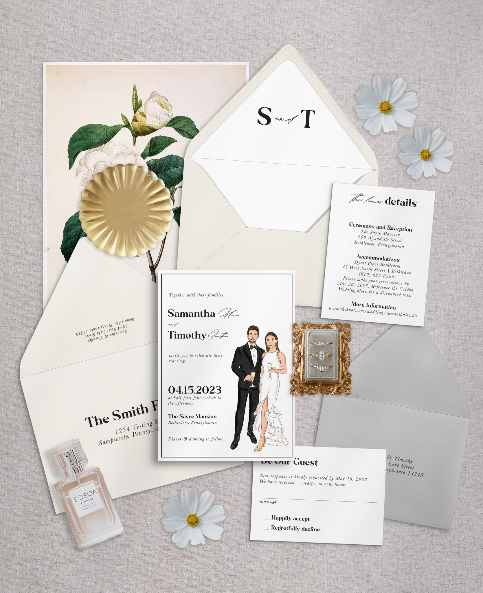 This semi-custom invitation set is perfect for couples hosting black-tie, formal, or modern celebrations who want their stationery to feel both personal and enduring. The result is an invitation that feels less like paper and more like a work of art, setting the tone for a celebration that is truly one of a kind.