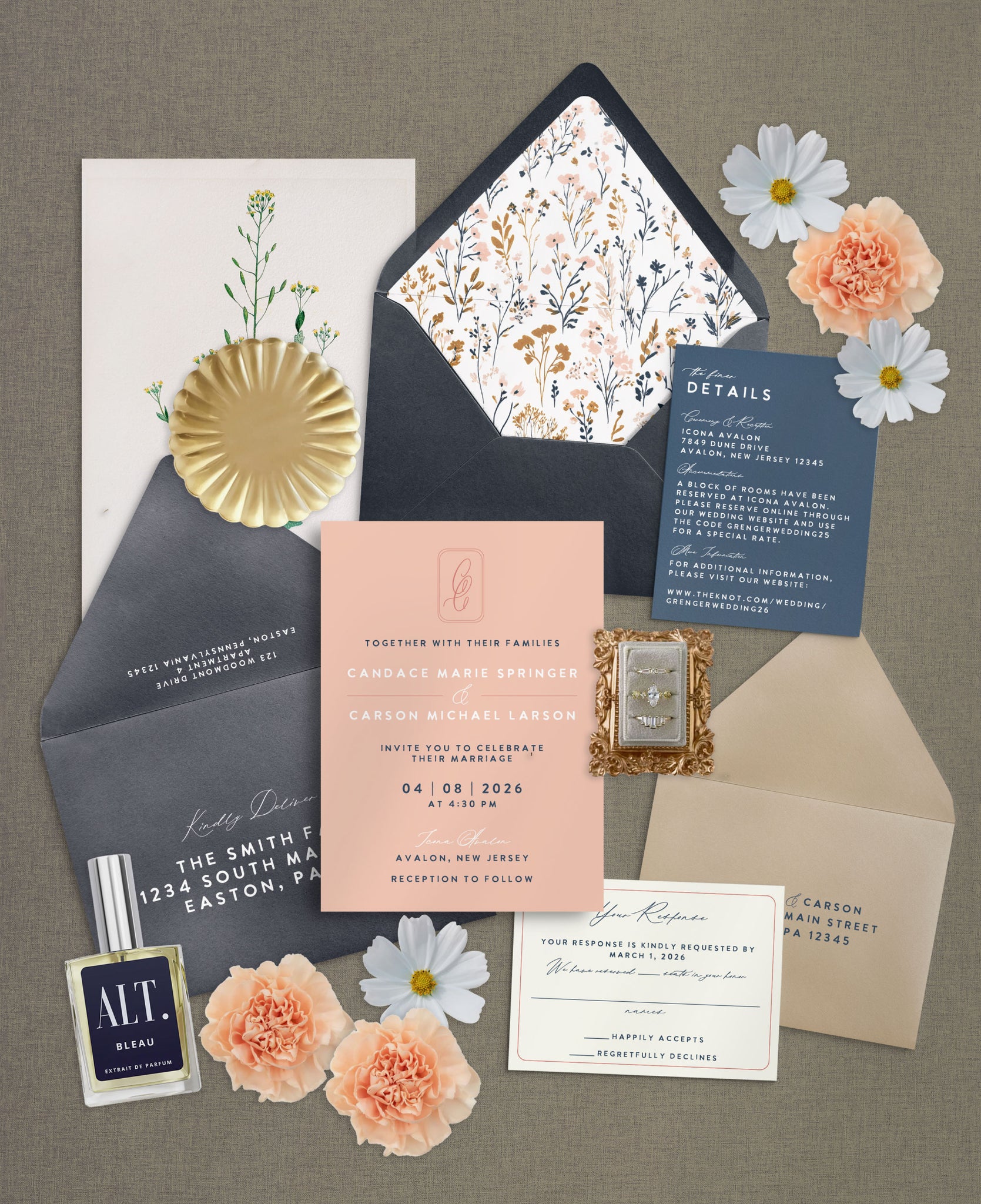 The Evening Petals invitation suite features a striking combination of soft peach, deep navy, and warm neutral tones. With modern typography, a custom monogram detail, and a floral envelope liner that feels painterly and refined, this suite creates a beautiful first impression for your wedding day.